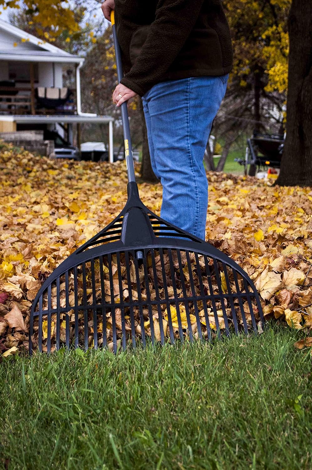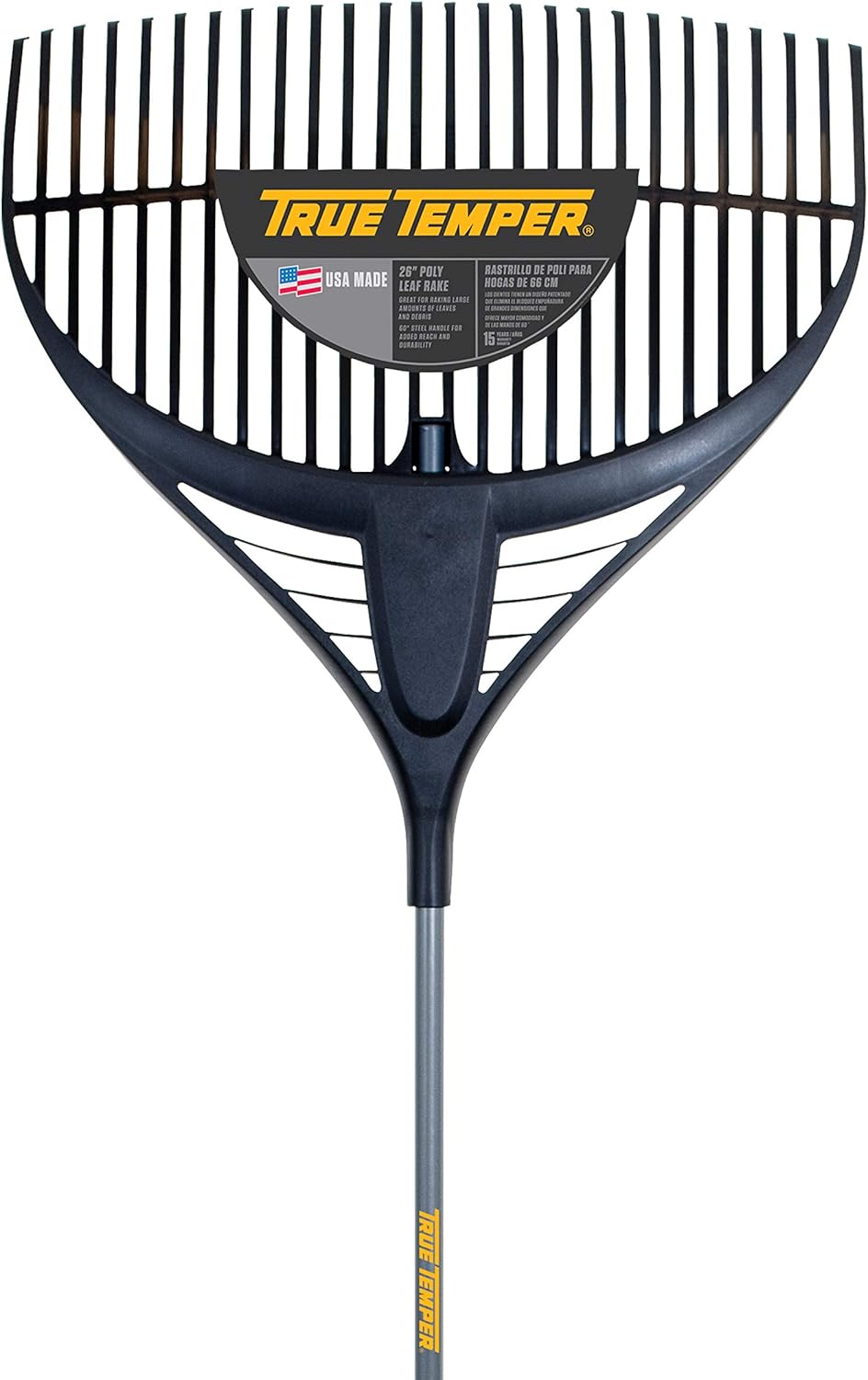 Ideal for large yards and big jobs, this True Temper leaf rake features a wide basket design to help gather more leaves in less time. In its unique design, all tines are in contact with the ground at one time so leaves are collected quickly and efficiently. The rakersquo;s lightweight materials minimize fatigue in the face of repetitive motion leaf raking but are also durable to withstand frequent use.