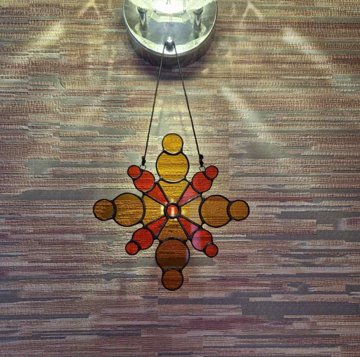 This unique geometric abstraction with balls is handmade of transparent stained glass in shades of yellow and red colors with a black finish in small family home studio. I work in tiffany stained glass technique. Each detail is cut from glass, copper foiled and soldered. The color may vary a little bit because of the monitor display. Stained glass abstraction is made individually. This is an example. I’ll make a new one to your order. Each suncatcher is unique, and therefore might differ slightly from the photo. The hue of stained glass may vary. It measures about 19 cm high and 19 cm wide (approx 7.5" x 7.5").